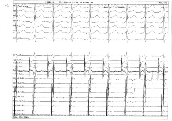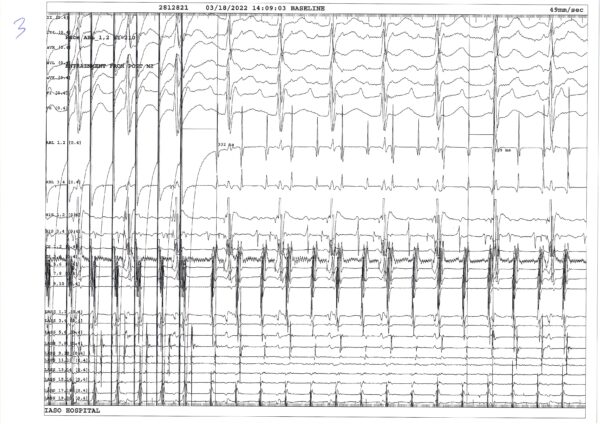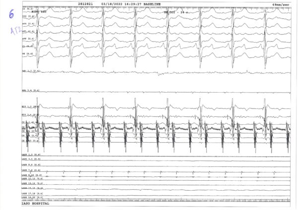 Ιστορικό: Πρόκειται για ασθενή με ιστορικό αρτηριακής υπέρτασης και μακράς διαρκείας εμμένουσα κολπική μαρμαρυγή από 1,5 έτους, μετά από λοίμωξη COVID-19. Στον απεικονιστικό έλεγχο ο ασθενής δεν έχει ενδείξεις δομικής καρδιακής νόσου, ενώ ο αριστερός κόλπος έχει διάμετρο 45 mm. Προσφάτως υποβλήθηκε σε επέμβαση κατάλυσης κολπικής μαρμαρυγής που περιλάμβανε απομόνωση των πνευμονικών φλεβών και του οπισθίου τοιχώματος. Ο ασθενής προσφάτως υποτροπίασε με εμμενουσα κολπική ταχυκαρδία και ταχεία κοιλιακή ανταπόκριση. Υποβλήθηκε σε ηλεκτρική ανάταξη, όμως η αρρυθμία υποτροπίασε με την ίδια μορφολογία. Λαμβάνει αγωγή με βισοπρολόλη και αντιπηκτική αγωγή με απιξαμπανη (5mg X2) την οποία δεν διέκοψε προεπεμβατικά. Εισάγεται για να υποβληθεί σε επέμβαση κατάλυσης με χρήση RF ενέργειας