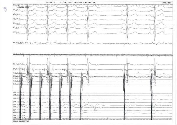 Εν συνεχεία, επί φλεβοκομβικού ρυθμου, έγινε γραμμή αποκλεισμού στον κοιλοτριγλωχινικό ισθμό που επιβεβαιώθηκε με βηματοδοτικούς χειρισμούς και με την χρήση του καθετήρα Duo-decapolar (Καταγραφές 11-12).